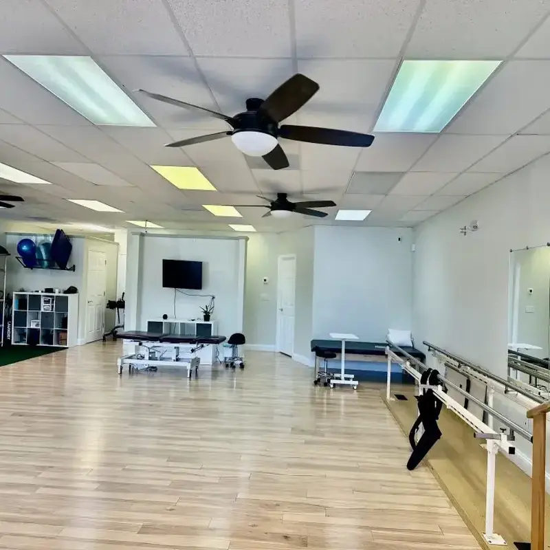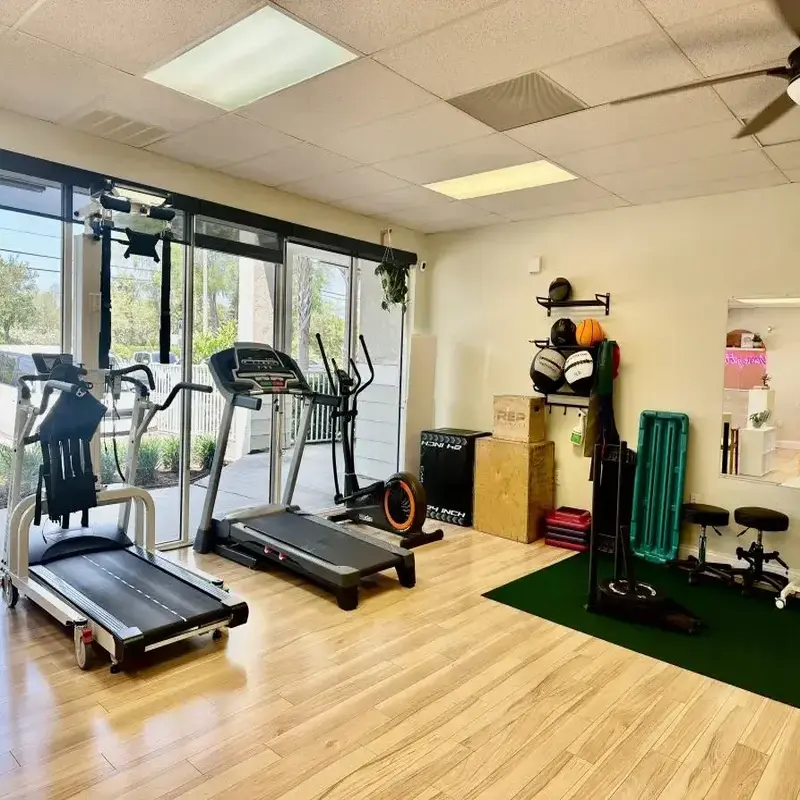 The clinic space is located inside Best Day Fitness. The space features a Rehab treadmill, a Litegait body weight support system, the Rifton TRAM for ambulation, safety harness for fall prevention, parallel bars, TRX system and weighted sled.